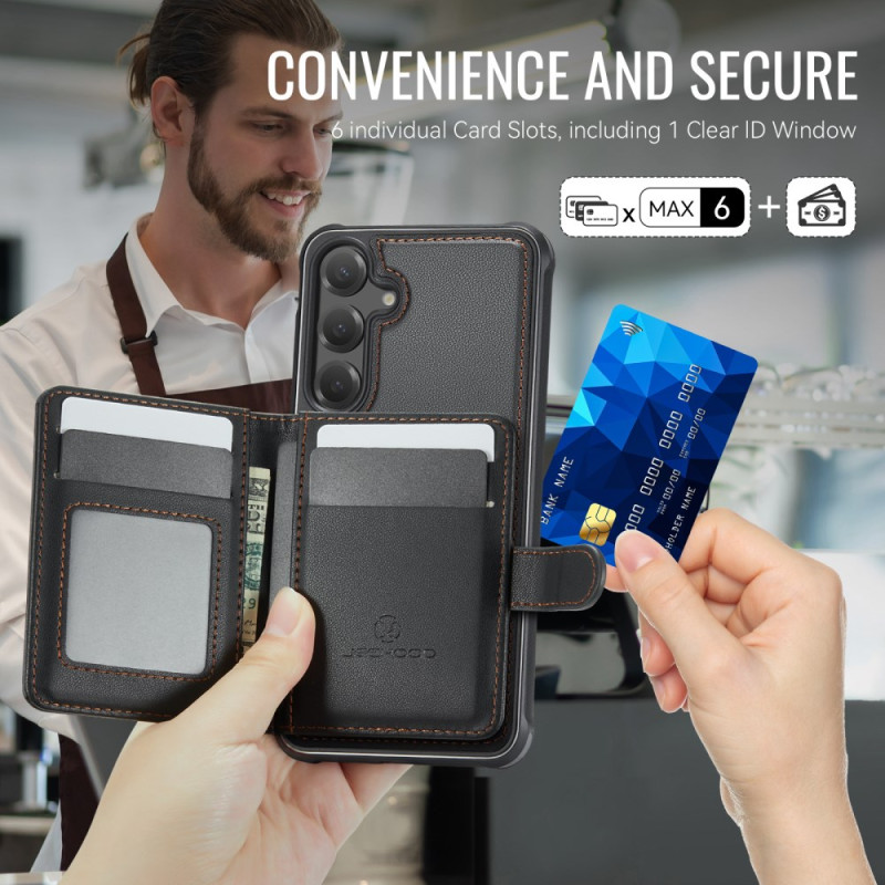 Protégez votre Samsung Galaxy S26 avec élégance grâce à cet étui magnétique multifonction JEEHOOD J09. Doté d'une protection RFID avancée, il sécurise vos cartes bancaires contre les lectures frauduleuses. Son portefeuille détachable offre 3 emplacements pour cartes, 2 compartiments billets et 1 fenêtre photo...