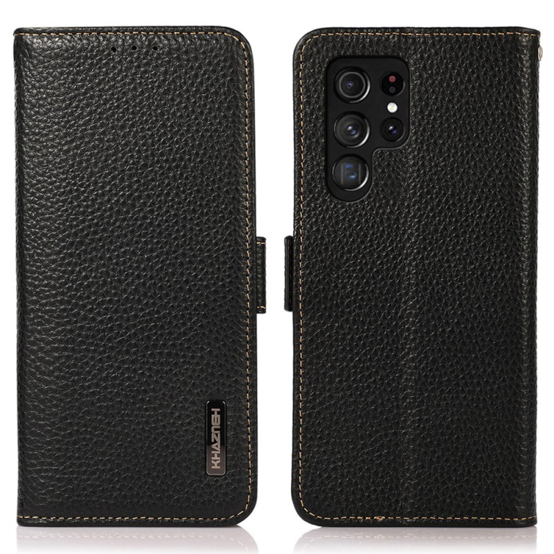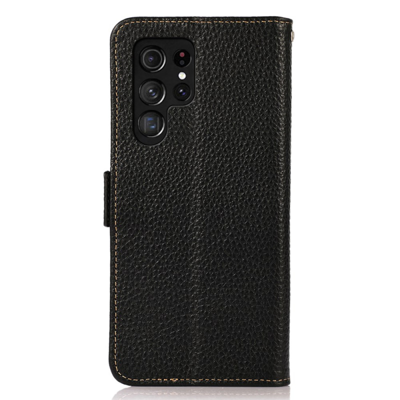 Raffinierte Tasche aus echtem Leder mit Litschi-Textur für das Samsung Galaxy S26 Ultra. Genießen Sie den erweiterten RFID-Schutz, praktische Kartenfächer und einen wandelbaren Ständer, mit dem Sie Ihre Inhalte in aller Freiheit ansehen können.