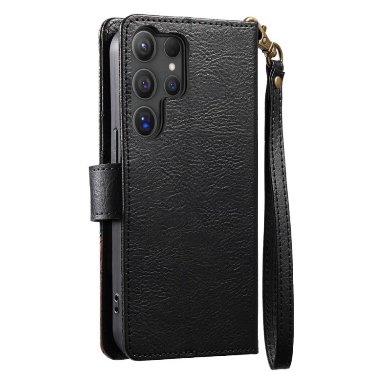 Étui portefeuille élégant pour Samsung Galaxy S26 Ultra. Conception en cuir PU et TPU premium avec fentes pour cartes, poche zippée et dragonne détachable. Protection antichoc complète avec fonction support intégrée pour un visionnage mains libres.