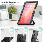 Entdecken Sie unsere robuste Hülle für das Samsung Galaxy Tab S11. Ausgestattet mit einem umfassenden Schutz, verstärkten Ecken und einem um 360° drehbaren Standfuß vereint sie Sicherheit und Funktionalität. Profitieren Sie von einer Stiftablage und einem verstellbaren Schultergurt für einen einfachen Transport.