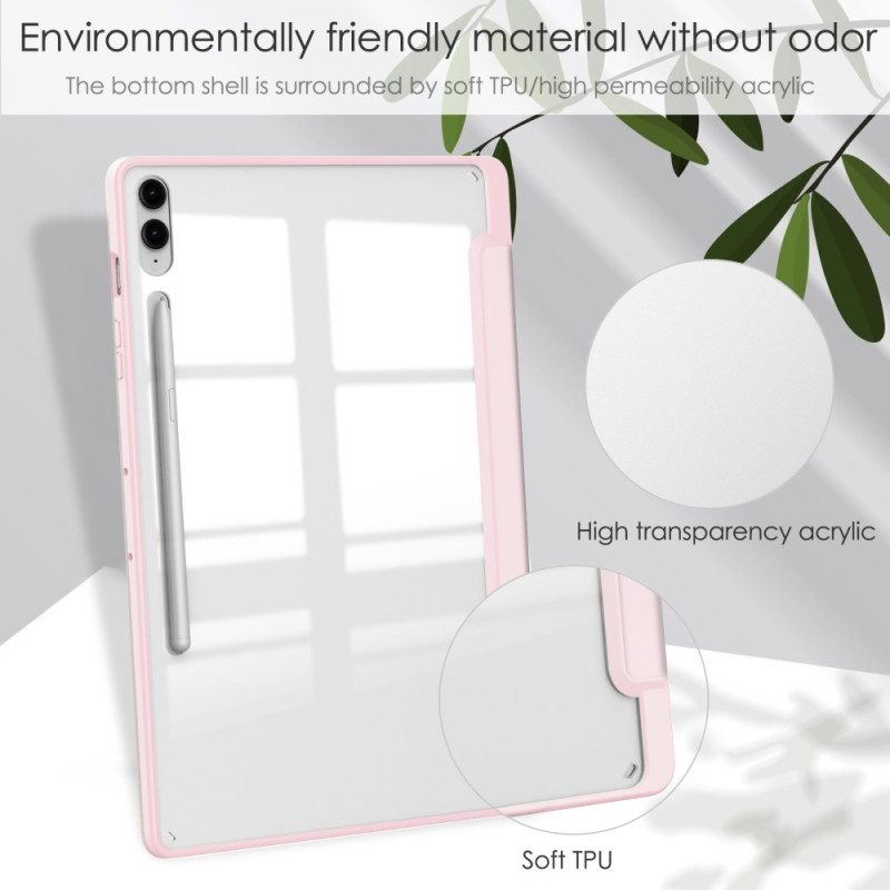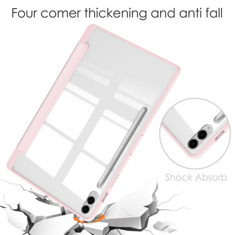Entdecken Sie unsere transparente Hülle für Samsung Galaxy Tab S9 FE Plus mit Stiftschlitz und Tri-Fold-Halterung.