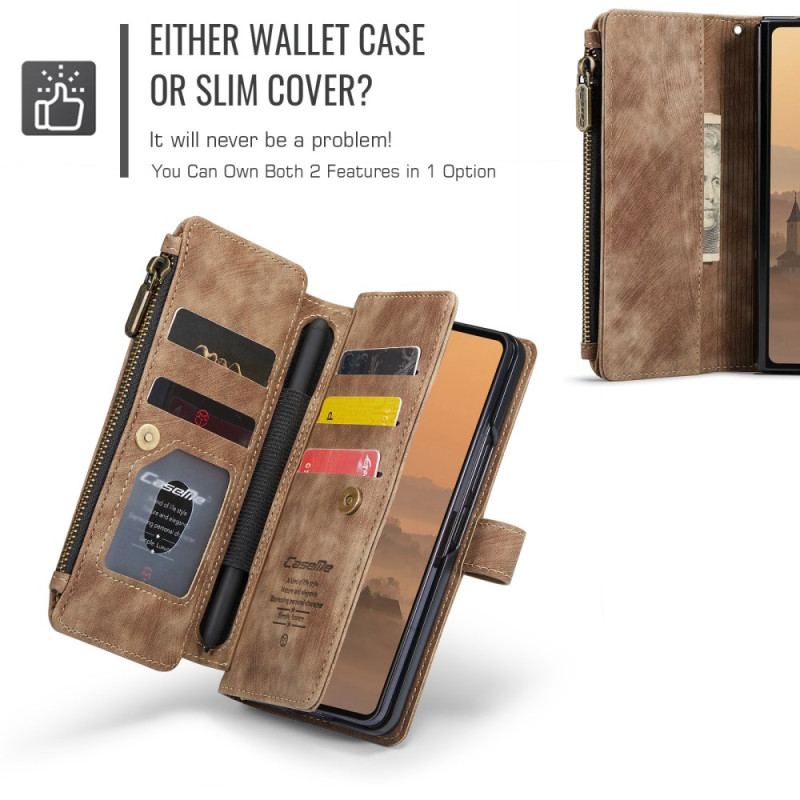 Entdecken Sie unsere Premium-Hülle für Samsung Galaxy Z Fold 7 5G. Sie ist aus strapazierfähigem PU-Leder und TPU gefertigt und bietet zuverlässigen Schutz und einen eleganten Look. Mit einem Reißverschlussfach, mehreren Fächern für Karten und Tickets, einer Krückenfunktion und einem Magnetverschluss vereint diese Hülle Praktikabilität und Stil für den optimalen täglichen Gebrauch.
