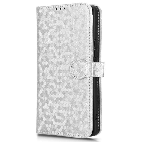 Elegante Brieftasche aus PU-Leder mit geprägtem Pünktchenmuster. Verstellbare Standfunktion für optimales freihändiges Betrachten. Integrierte Fächer für Karten und Geldscheine. Inklusive praktischer Handschlaufe für einen sicheren Transport.