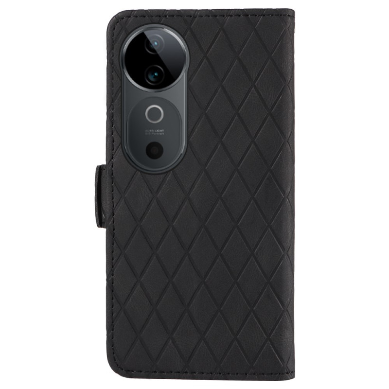 Elegante Tasche für das Vivo V40 5G mit gepolstertem Rautenmuster. Zwei-Materialien-Design mit einer Kombination aus PU-Leder und TPU für einen edlen Stil und dauerhaften Schutz. Drei Kartenfächer und ein integriertes Seitenfach für eine praktische All-in-One-Lösung.