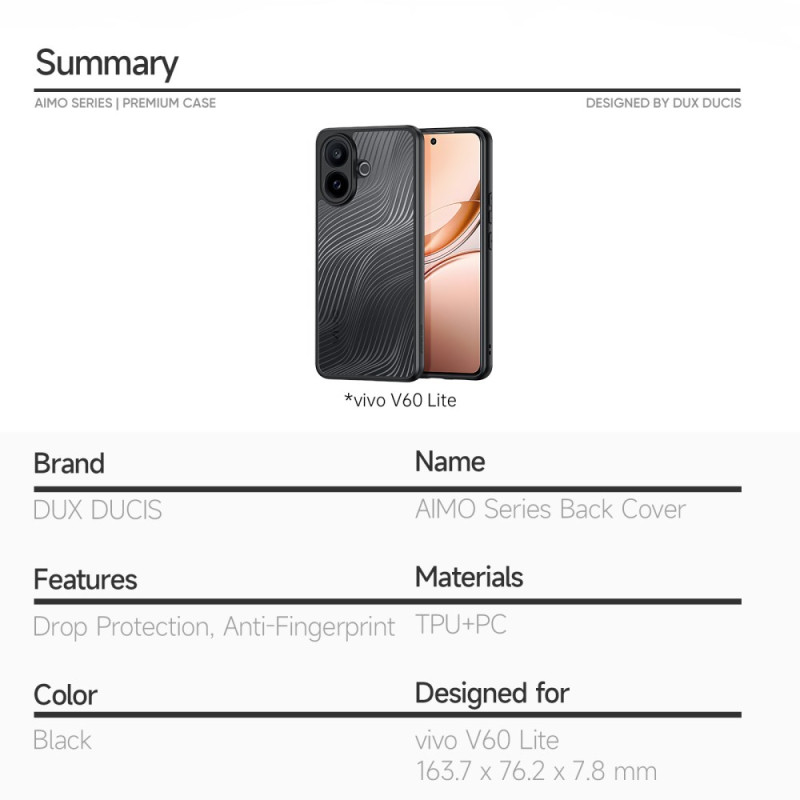 Schützen Sie Ihr Vivo V60 Lite 5G stilvoll mit der DUX DUCIS Aimo Hülle. Die zweischichtige Konstruktion bietet einen robusten Schutz vor Stürzen aus bis zu 1,2 m Höhe und ist SGS-zertifiziert. Elegantes mattes Design mit fließenden Linien, komfortabler Griff.