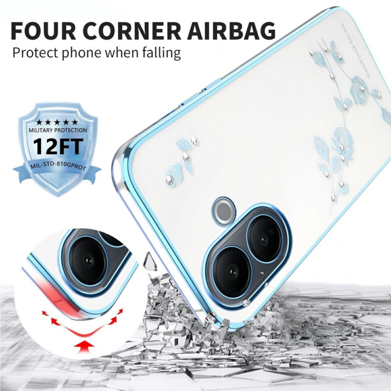 Schützen Sie Ihr Vivo V60 Lite elegant mit dieser Hülle, die mit funkelnden Strasssteinen und handgefertigten ewigen Blumen verziert ist. Sie besteht aus TPU in Militärqualität mit elektroplattierten Rändern und bietet optimalen Schutz.
