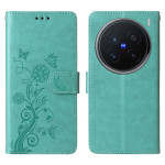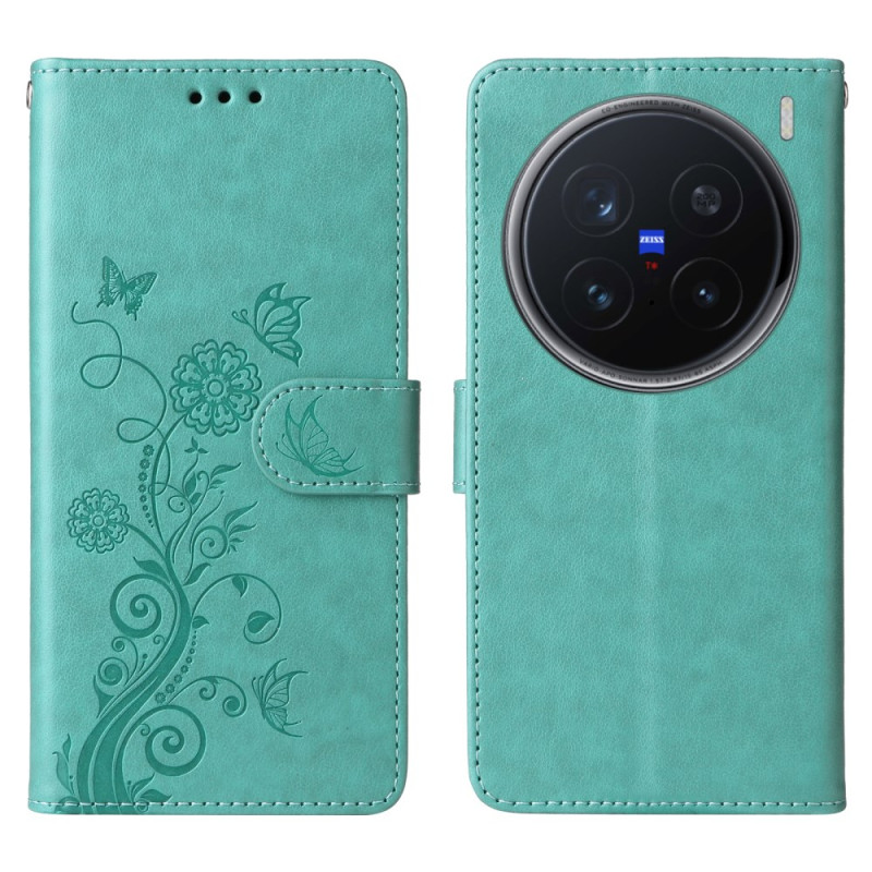 Elegante Tasche aus Kunstleder für das Vivo X200 Pro 5G mit Blumen- und Schmetterlingsdruck. Verfügt über einen integrierten Ständer, Kartenschlitze und ein Brieftaschenfach. Umfassender Schutz mit praktischer Handschlaufe für den einfachen Transport.