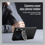 • Verschiebbare Kameraabdeckung mit integriertem Ständer für freihändiges Betrachten und zusätzlichen Schutz Ihrer Objektive