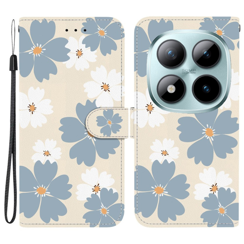 Schützen Sie Ihr Xiaomi Redmi Note 15 Pro 5G elegant mit dieser Brieftasche mit blauem Gänseblümchen-Motiv. Ausgestattet mit einem faltbaren Ständer, Kartenfächern, einem sicheren Magnetverschluss und einer praktischen Handschlaufe für den einfachen Transport.