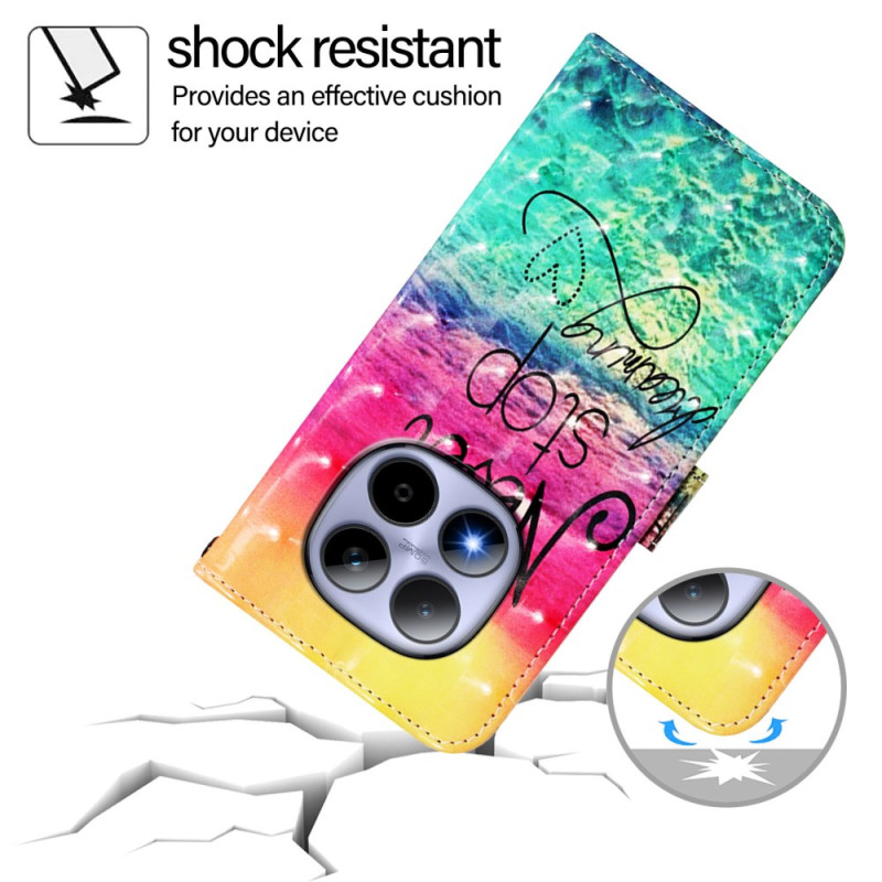 Schützen Sie Ihr Xiaomi Redmi Note 15 Pro 5G stilvoll mit dieser multifunktionalen Brieftasche. Inspirierendes "Never Stop Dreaming"-Design, 3 Kartenfächer, Bargeldfach und verstellbare Halterung für die freihändige Nutzung.