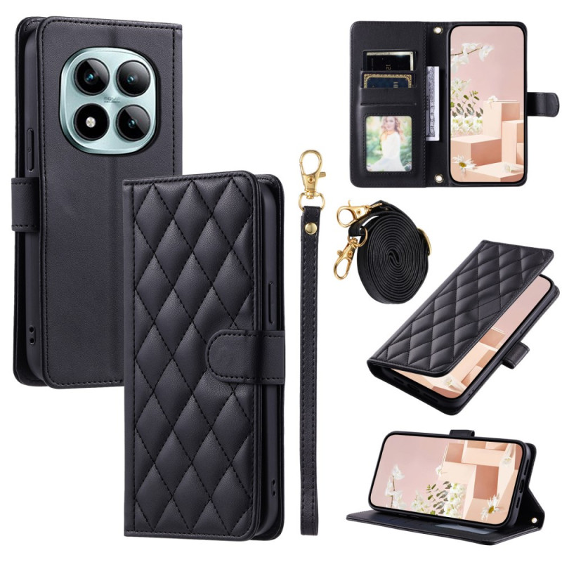 Étui portefeuille élégant en cuir PU avec motif losange pour Xiaomi Redmi Note 15 Pro 5G. Comprend bandoulière réglable, dragonne, porte-cartes et fonction support. Protection intégrale contre les chocs et rayures avec accès facile à toutes les fonctions.