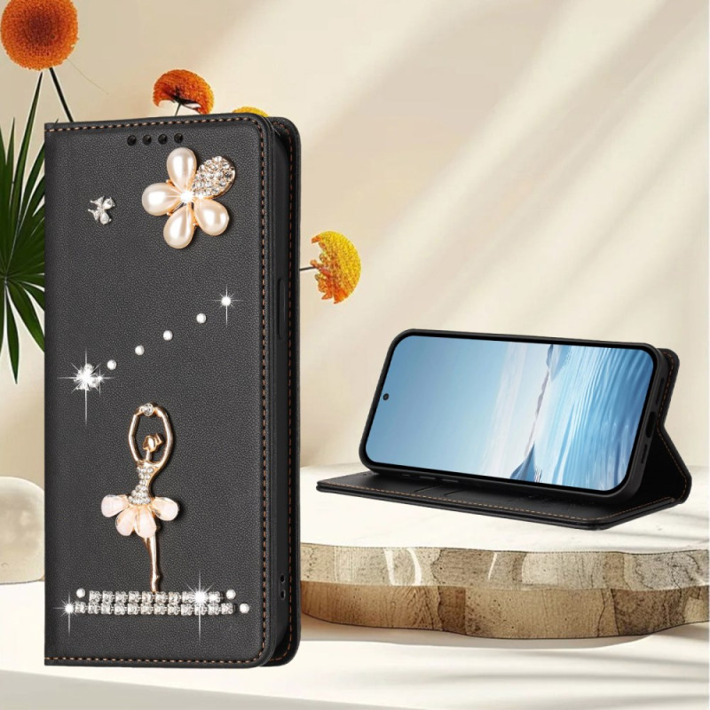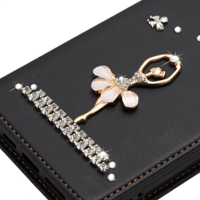 Élégant étui portefeuille à rabat avec danseuse ballet ornée de strass. Protection RFID intégrée pour sécuriser vos cartes bancaires. Fonction support ajustable pour visionnage mains libres. 2 emplacements cartes et 1 compartiment billets.